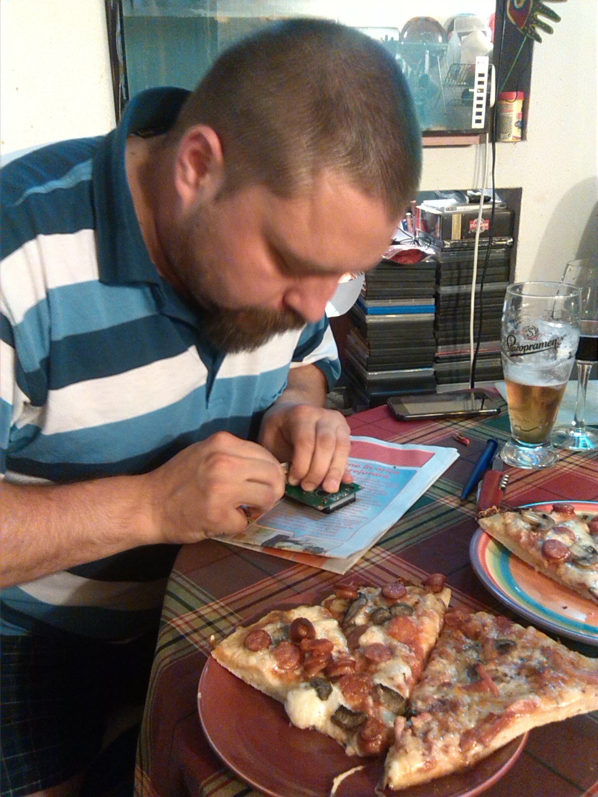 Aici pozele si actualizarea faptului ca nici 'pe direct' n-a mers ce trebuie / cum trebuie. O sa-mi iau un ridicator de tensiune de la 3.3V la 5V ca sa alimentez gunoiu direct din placa (si nu din sursa separata ca nu mai are nici un VCC dupa asta, si n-am facut practic nimic) si multe fire si alte chestii si trestii si mai vedem ce iese.