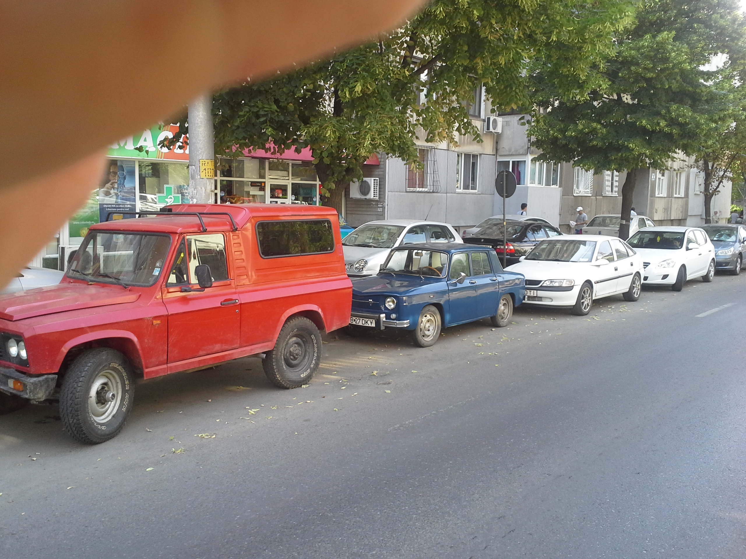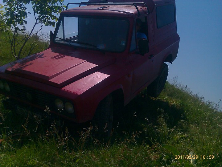 ARO 243 Culoare: Rosu - de aici si numele Motorizare - D127 Transmisie: CV in 4, grupuri 8/33, blocand spate actionat prin cablu (deocamdata nefunctional, trebuie reglata cursa) Anvelope: Goodiear Wrangler A/T 235/85/R16 montate pe jantele originale pe ARO de 16 - arata bine, inalta masina dar sunt cam mari chiar si pentru motorizarea Brasocv si grupuri 8/33 Geamurile laterale si luneta acoperite cu folie neagra - cam nasol la vizibilitate (oricum in 243 e mai complicata vizibilitatea) dar foarte oki la pastra un mediu ambiant placut chiar si-n zilele toride Bari: nu prea are, in spate deloc, in fata am atarnat o ruginatura ca sa fac "ïdentificarea" la RAR