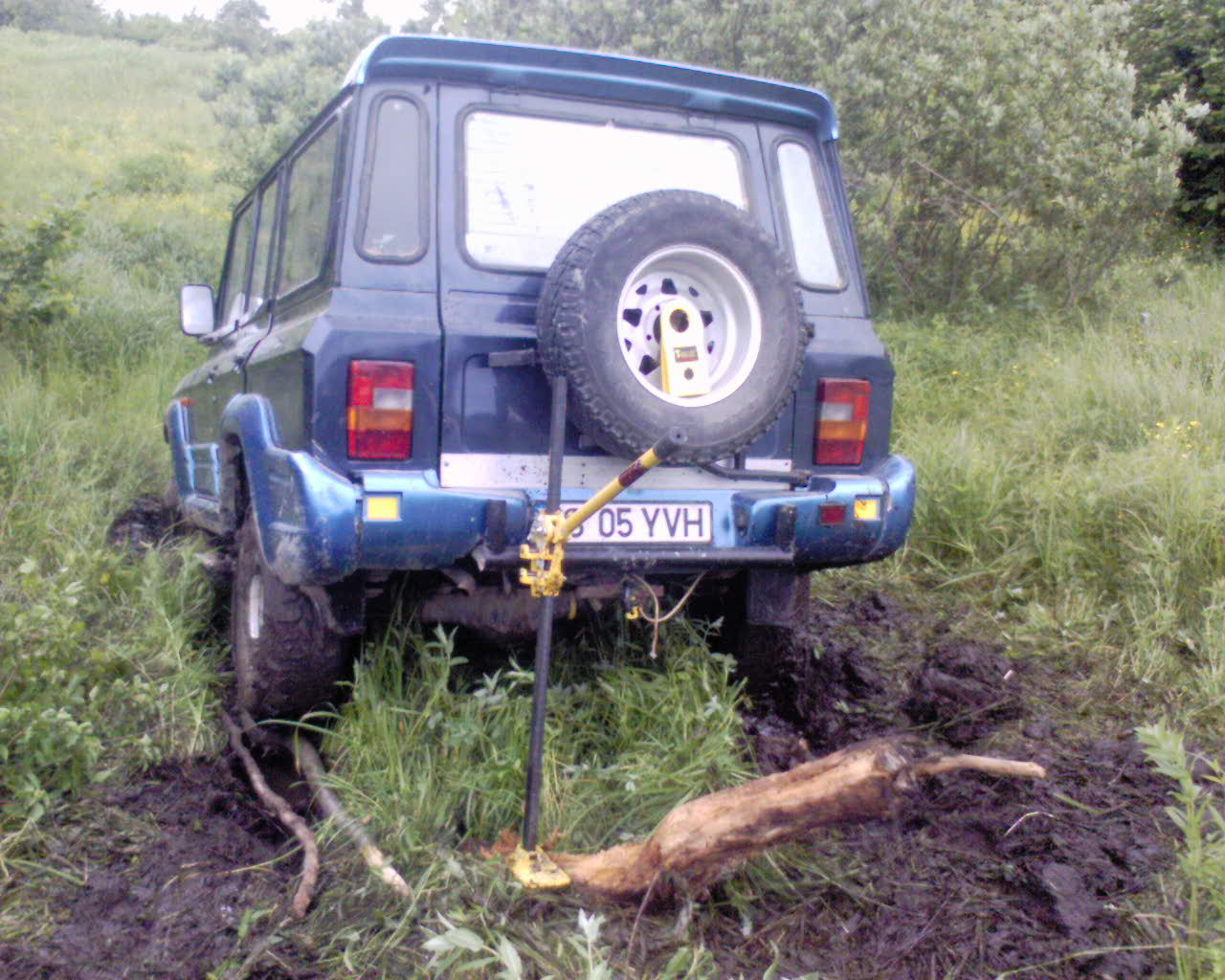 In incercarea de a gasi un loc de iesire din valea cu lucerna, Alcool a vazut o mlastina, nu a rezistat si s-a aruncat in ea. Ama a avut probleme la alimentare, iar eu am urcat sus, numai ca apoi sa cobor inapoi, si sa raman infipt intr-o buturuga. Astfel incat, trei masini imobilizate... Am reusit sa re-pornim masina lui Ama, am reusit cu un HiLift sa eliberam masina mea, care acum nu mai pornea, tot cu probleme la alimentare. Am tractat-o cu Ama, si in cele din urma a pornit. Amandoi ne-am apucat sa tragem de Alcool, care insa era mult prea bine infipt in mlastina, si desi doua ARO cu Brasov trageau deodata de el, nu s-a clintit. In tot acest timp Emilia dormea :D