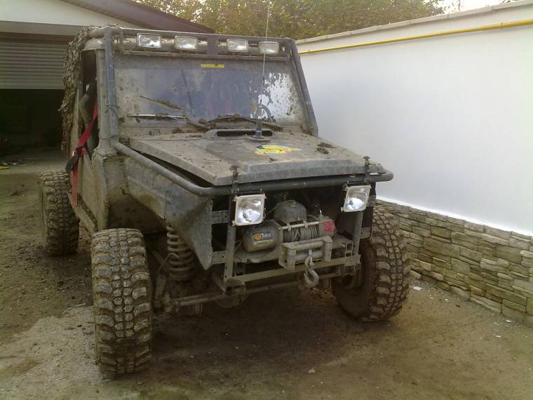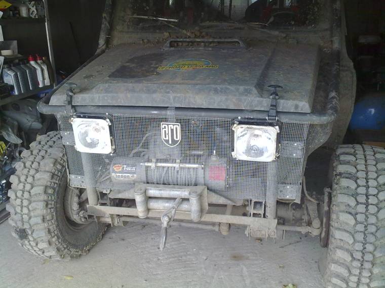 Deocamdata am pus faruri patrate de tractor,primite in dar de la Stef (multumesc lui cabestan)masca fatza nu prea mai incape,plus ca ar trebui sa mai fac o gaura in ea pt a putea umbla la ambreiajul troliului ,deci mare lucru nu mai ramine din ea,intre faruri am sa pun stema si cam atit.